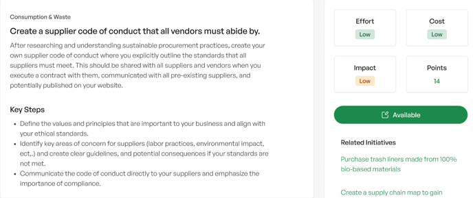 You can choose to hide any of the advanced initiatives if you only want to focus on the environmental aspect of sustainability. However, we encourage you to build all three pillars of sustainability, environmental, social, and governance, into your sustainability program.