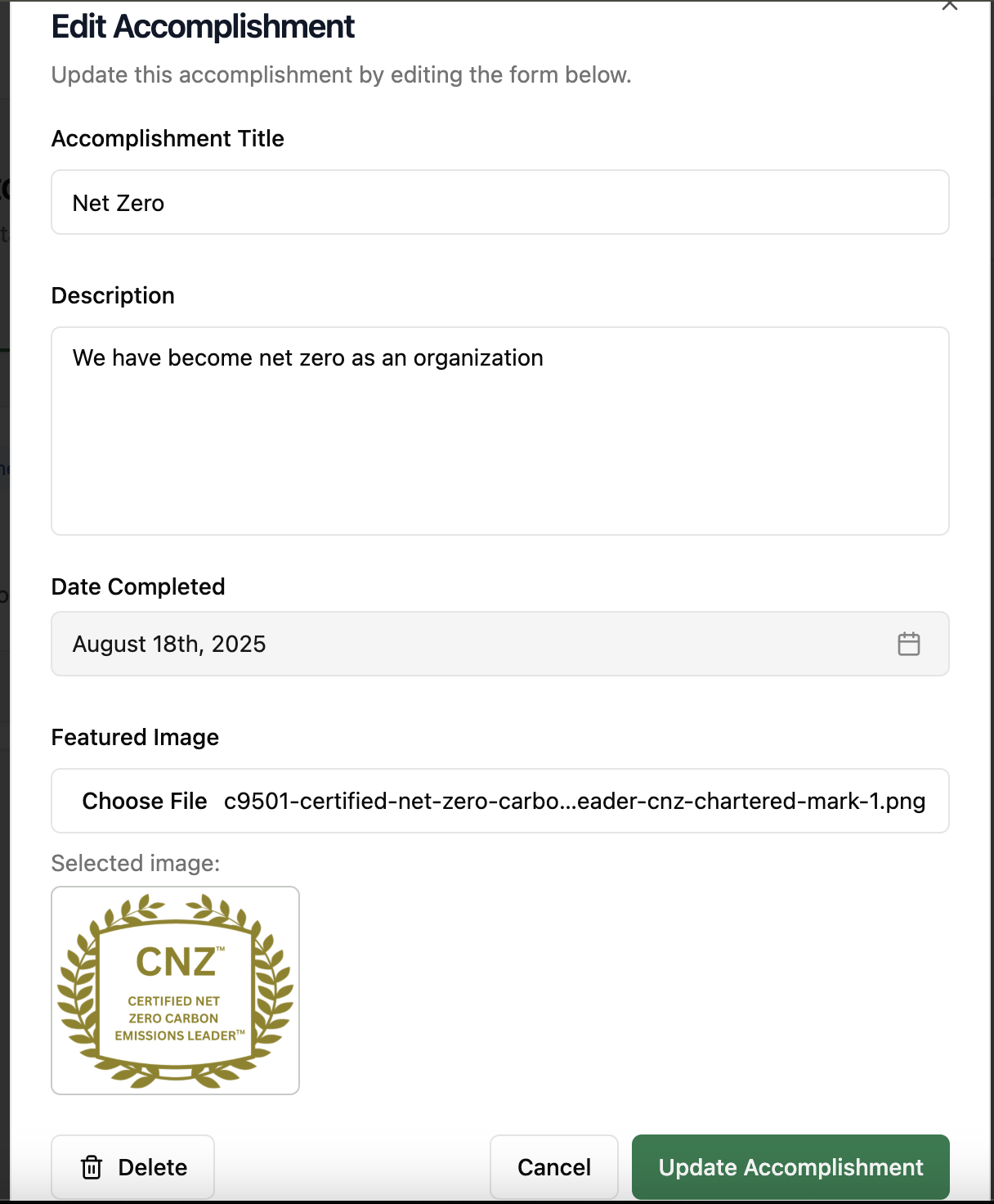 As you establish your sustainability program, you will start reaching significant achievements you want to share publicly. These can supplement your completed initiatives on your public profile, either by giving in-app initiatives more context or showcasing accomplishments unique to your organization.
