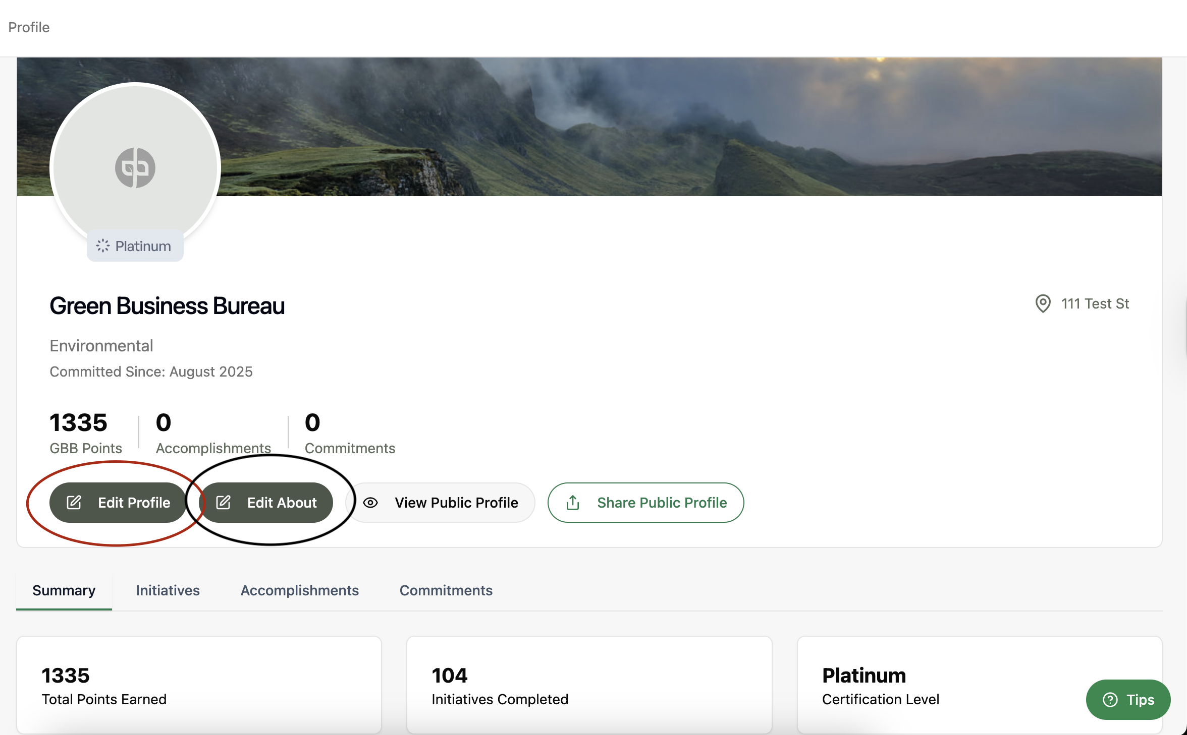 - Click the Edit Profile button to add your organization's mission statement. This can be your mission as it relates to sustainability to illustrate your commitment.