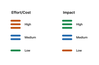 - For impact, you strive for highest impact, so high=three green bars, medium=two blue bars, and low=one orange bar.