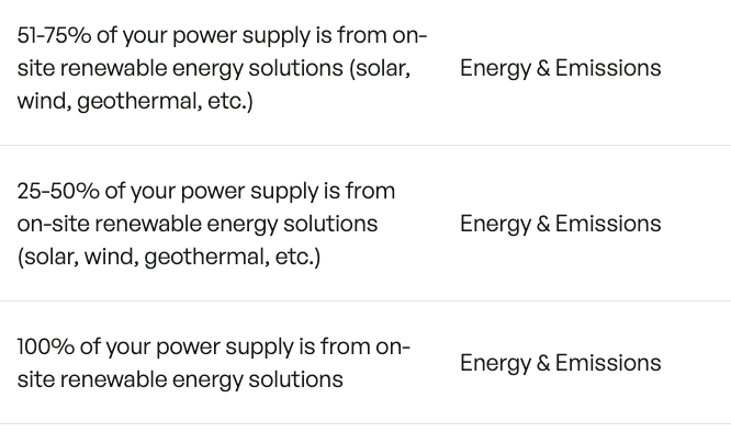 - Ex: For the below initiatives, if your organization is at 40% renewable energy, you should select "25-50% of your power supply is from on-site renewable energy solutions". If your mix of renewable energy increases to 55%, you should deselect the previous 25-50% initiative and only select the 51-75% initiative.